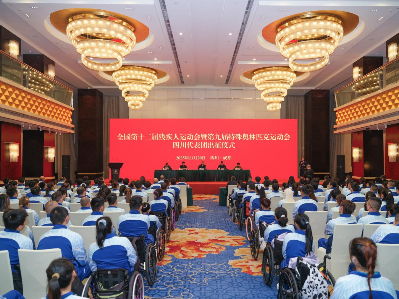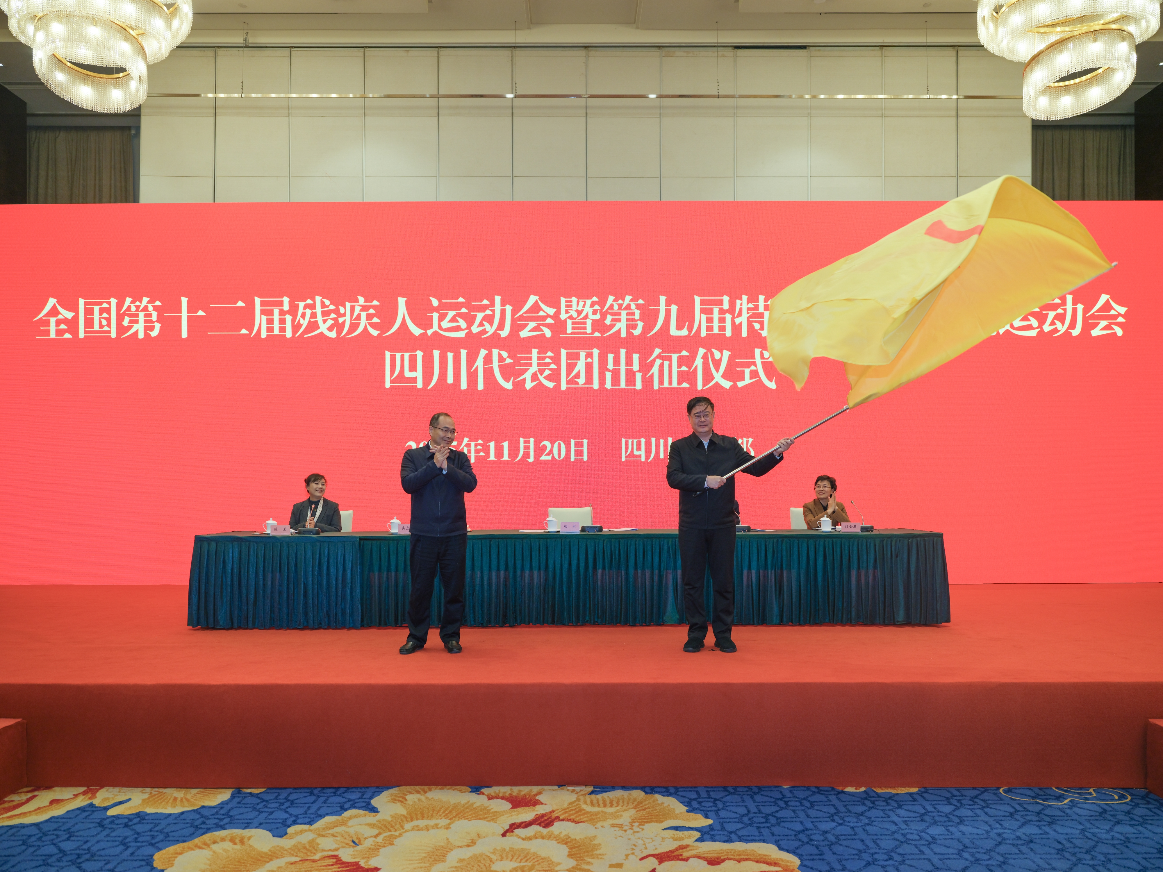 11月20日,全国第十二届残疾人运动会暨第九届特殊奥林匹克运动会四川体育代表团出征动员活动在成都举行。副省长、代表团团长胡云为代表团授旗并作出征动员讲话。省政府副秘书长、办公厅主任、代表团副团长王建军主持会议,省残联理事长、代表团副团长吴立岩接旗,省残联副理事长、代表团秘书长陈兰介绍代表团组团及备战情况,残疾人网球运动员王紫莹、残疾人射箭队主教练沈平分别代表运动员、教练员作表态发言。